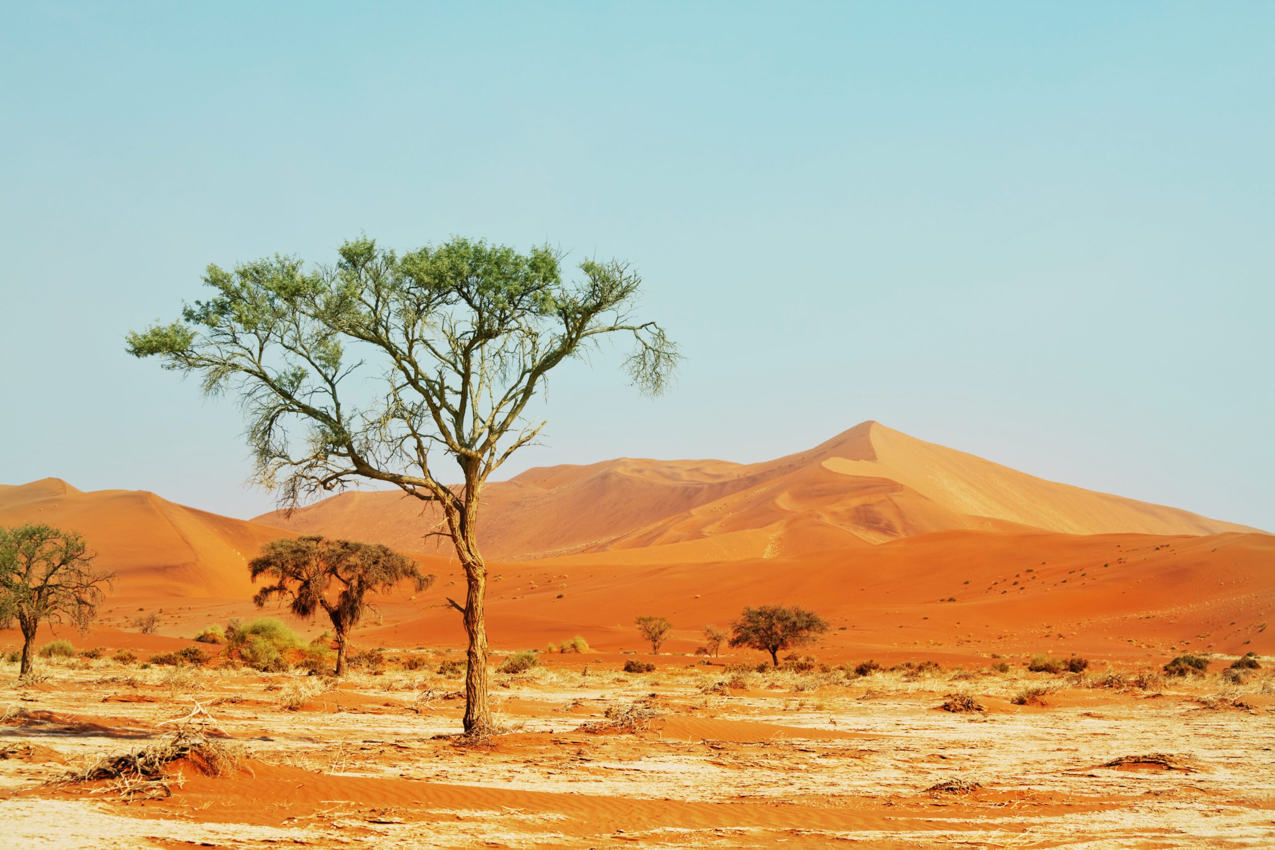 with dead, skeletal camelthorn trees. These trees have been a feature on this landscape for over